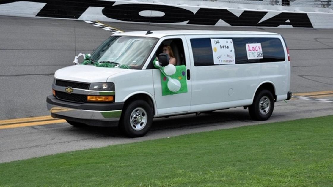 Led by the France family, NASCAR, and the team at Daytona International Speedway, graduates were invited to the speedway for the ceremony and allowed to bring only one car. Cynthia rented a 15-passenger van and invited her sister, Chantel; brother-in-law, Randy; graduating niece, Katie; and niece Carla Aceto, of Stafford, to come to down and support Lacy.