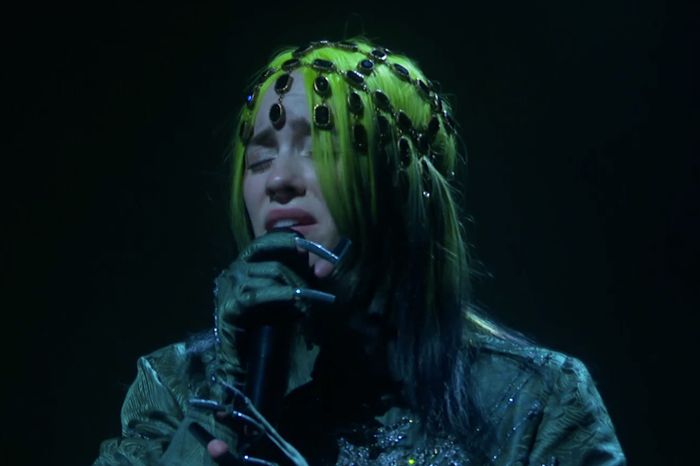 We wish Billie Eilish and her bejeweled headpiece a very good Grammys. Photo: CBS